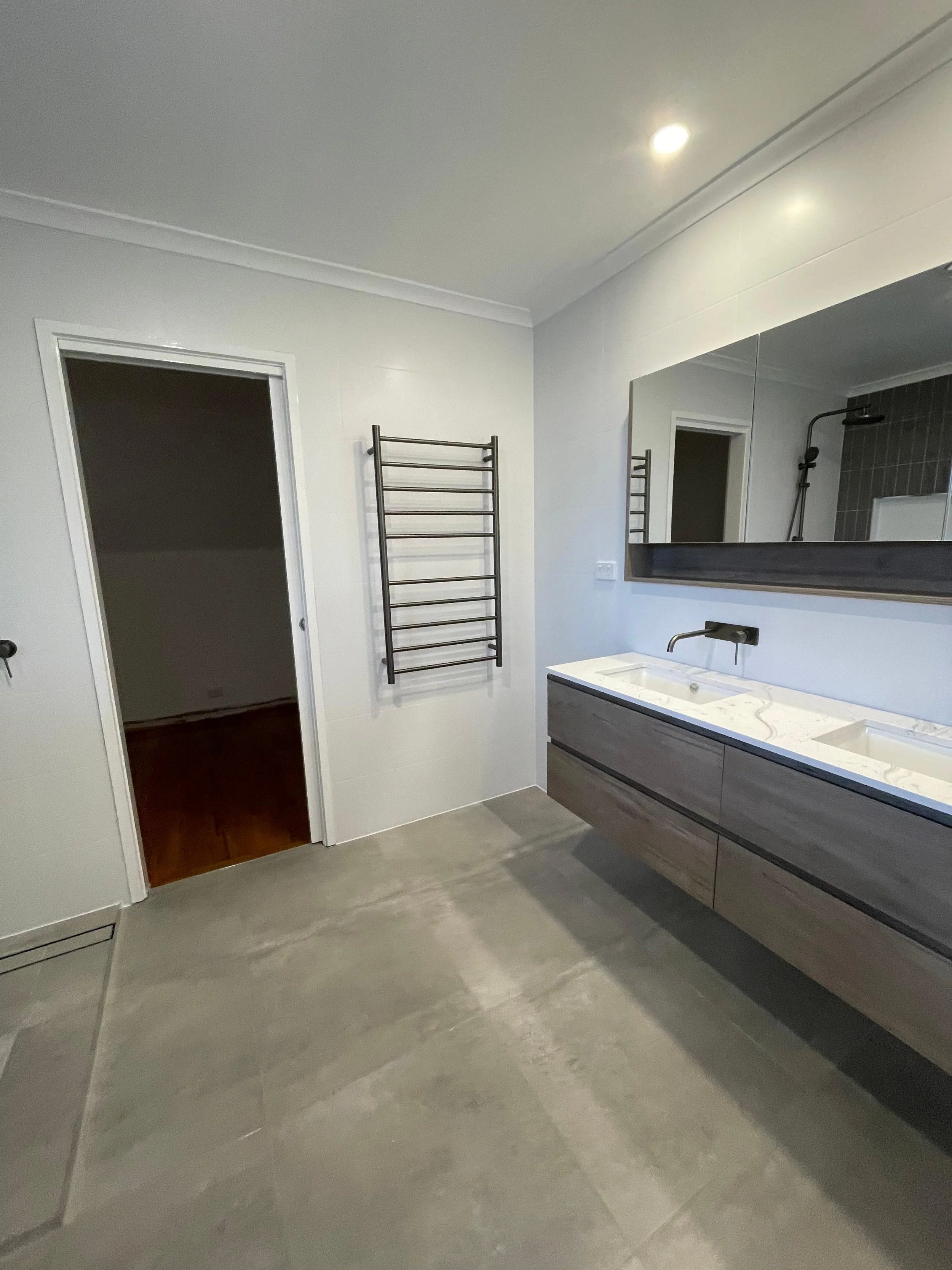 A heated towel rail ensures comfort and adds a touch of luxury, while the large mirror enhances the room's spacious feel. The minimalist design of the toilet and the subtle, yet impactful, lighting contribute to a serene and inviting atmosphere. This bathroom renovation seamlessly blends functionality with high-end design, making it the perfect retreat for relaxation and rejuvenation.